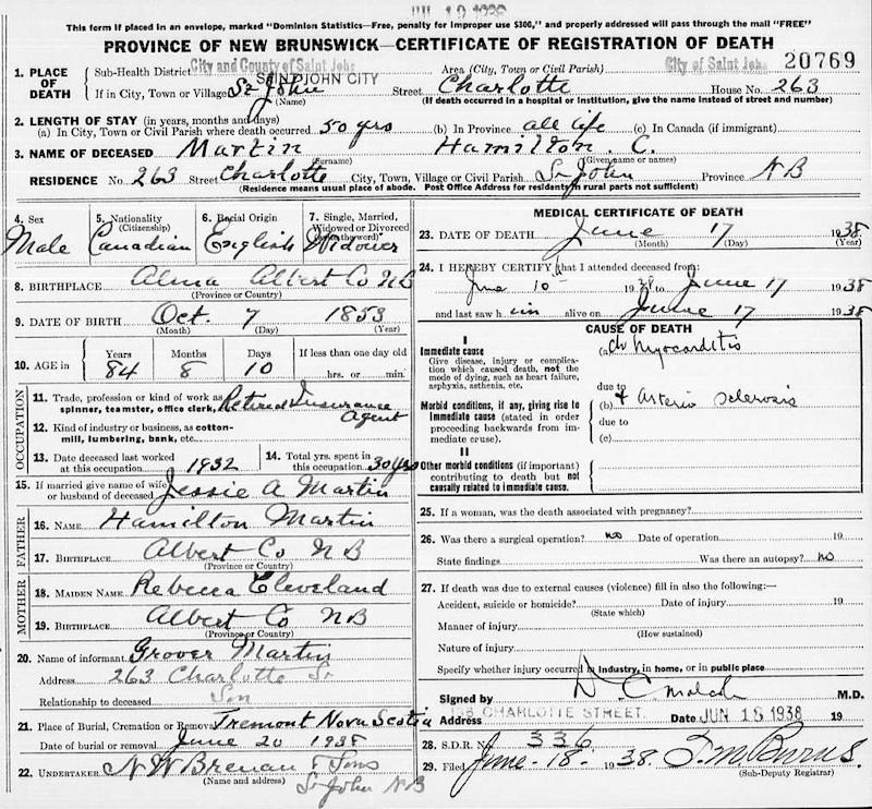 Birth Born on October 07, 1853 in Alma, Albert Co., NB Death Died on June 17, 1938 in Saint John, Saint John Co., NB Buried in Old Tremont Cemetery in Tremont Kings Co., NS Marriages BAKER, Jessie Alice Married on June 15, 1881 in Tremont Kings Co., NS Children MARTIN, Chester Bailey: June 22, 1882 - April 02, 1958 MARTIN, Grover Cleveland: October 11, 1885 - July 28, 1970 MARTIN, Melita Lavinia: October 05, 1895 - January 31, 1955 Notes Occupation: Insurance Agent Marriage Notice: m. Bethel Tremont, 15th ult., by Rev. F. Beattie, Hamilton C. MARTIN, Alma (ALbert Co.) / Jessie A. BAKER d/o Reuben BAKER, Esq., Tremont, Kings Co., N.S. Chignecto Post Sackville,NB July 7,1881 Death: Chronic Myocarditis Sources NB Deaths: #20769 Images Hamilton Martin Hamilton Martin Death Jessie Baker Marriage