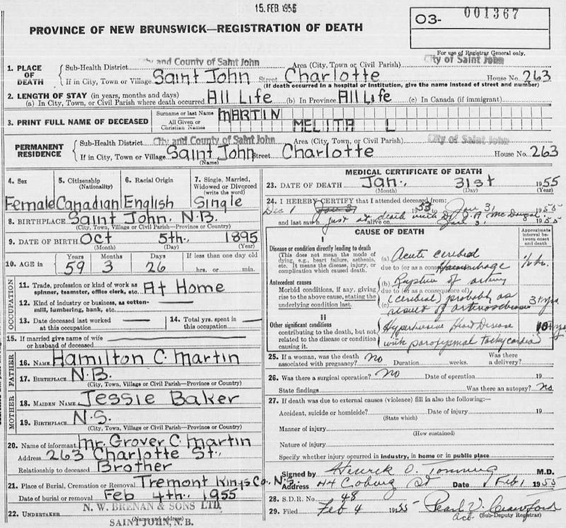 Parents Father: MARTIN, Hamilton Cleveland Mother: BAKER, Jessie Alice Birth Born on October 05, 1895 in Saint John, Saint John Co., NB Death Died on January 31, 1955 in Saint John, Saint John Co., NB Buried in Old Tremont Cemetery in Tremont Kings Co., NS Notes Death: Acute Cerebral Hemorhage/ Rupture of Cerebral Artery Sources NB Deaths: #1367 Images Melita Martin Birth Melita Martin Melita Martin Death
