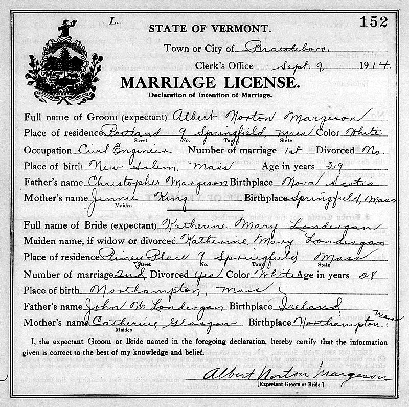 Birth Born on May 04, 1885 in Northampton, Hampshire Co., MA Death Died on November 02, 1958 in Brookhaven, Suffolk Co., NY Marriages MARGESON, Albert Norton Married on September 09, 1914 in Brattleboro, Windham Co., VT Notes Occupation: Music Teacher Sources New York Deaths: #79753 Images Kathryn Londergan Birth Albert Margeson Marriage Albert Margeson Marriage License