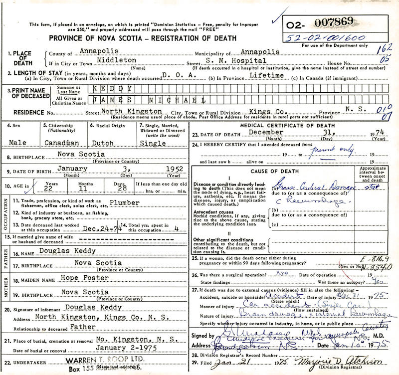 Parents Father: KEDDY, Douglas Arthur Mother: FOSTER, Hope Frances Birth Born on January 03, 1952 in Kings Co., NS Death Died on December 31, 1974 in Middleton, Annapolis Co., NS Buried in North Kingston Cemetery in North Kingston, Kings Co., NS Notes Death: Automobile Accident Cerebral Damage/ Internal Hemorhage Occupation: Plumber Sources Nova Scotia Deaths: Year 1974 #7869 Images Douglas & Hope (Foster) & James Keddy James Keddy Death