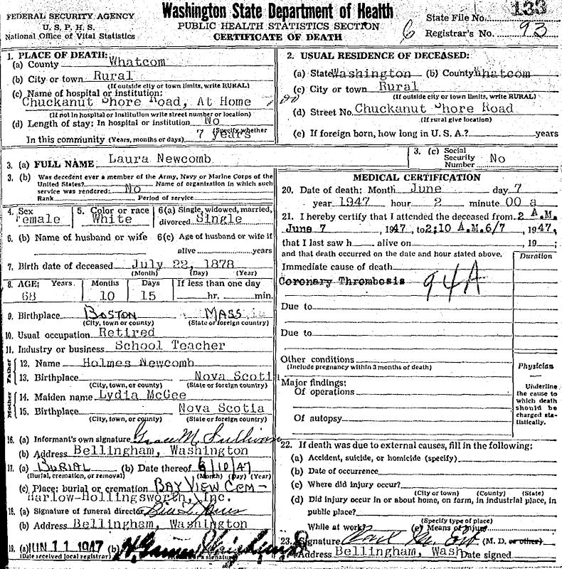 Parents Father: NEWCOMB, Holmes Morton Mother: MAGEE, Mary Eliza Birth Born on July 22, 1879 in Boston, Suffolk Co., MA Death Died on June 07, 1947 in Whatcom Co., WA Buried in Bayview Cemetery in Bellingham, Whatcom Co., WA Notes Occupation: Teacher Death: Coronary Thrombosis Sources Washington Deaths: #133 Images Laura Newcomb Birth Laura Newcomb Laura Newcomb Death