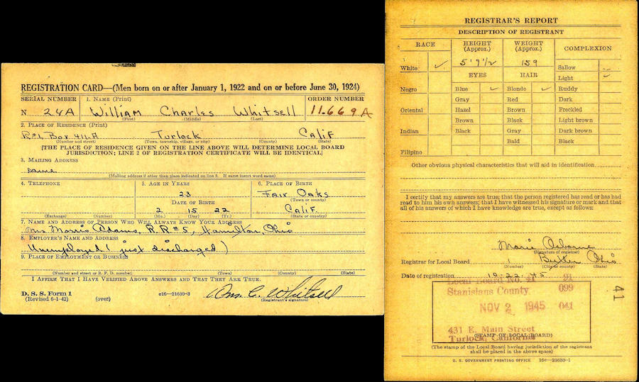 Parents Father: WHITSELL, William Vernon Mother: NEWCOMB, Ruth Helen Birth Born on February 15, 1922 in Fair Oaks, Sacramento Co., CA Death Died on April 03, 1989 in Modesto, Stanislaus Co., CA Marriages CLOYD, Lydia Eleanor Catherine Notes Military Service: WW2 US Army Images William C. Whitsell WW2 Draft