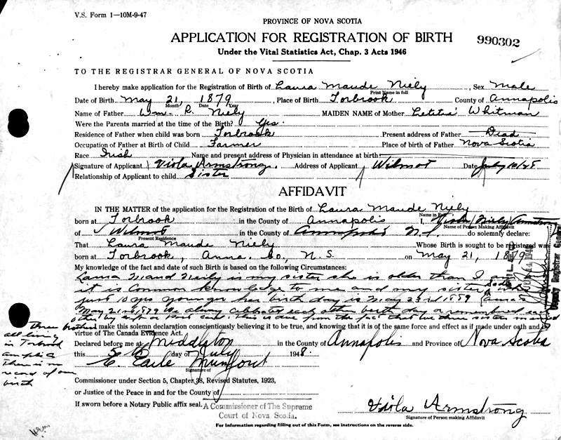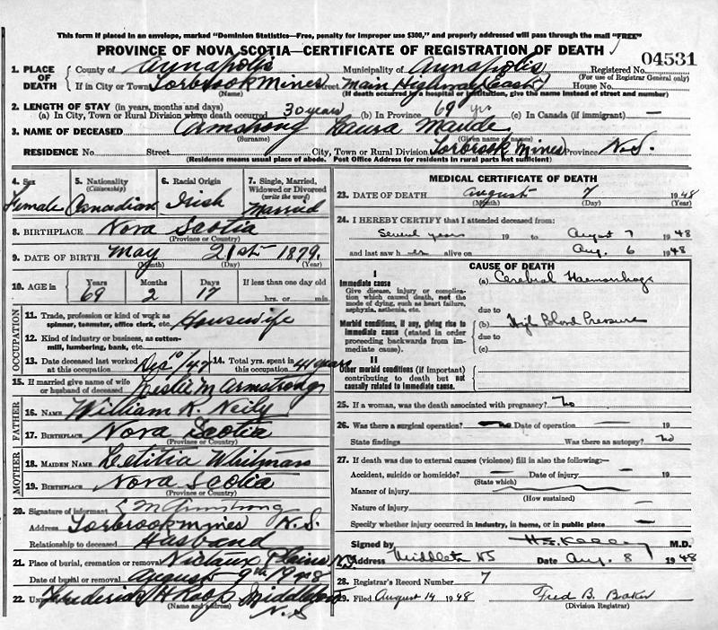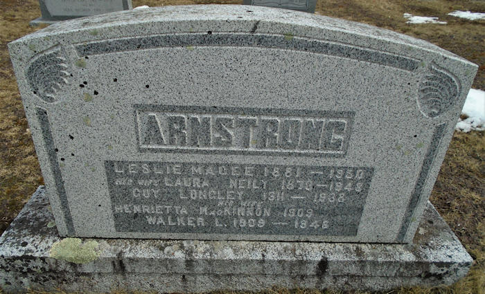 Birth Born on March 21, 1879 in Torbrook Mines, Annapolis Co., NS Death Died on August 07, 1948 in Torbrook Mines, Annapolis Co., NS Buried in Nictaux Cemetery in Nictaux, Annapolis Co., NS Marriages ARMSTRONG, Leslie Magee Married on July 17, 1907 in Torbrook Mines, Annapolis Co., NS Children ARMSTRONG, Margaret Odessa: May 14, 1908 - January 28, 2000 ARMSTRONG, Walker Leslie: August 05, 1909 - January 23, 1948 ARMSTRONG, Guy Longley: December 08, 1911 - October 22, 1938 ARMSTRONG, Carl Bishop: December 27, 1913 Notes Death: Cerebral Hemorhage Sources Nova Scotia Deaths: Year 1948 #4531 Images Laura Neily Birth Leslie & Laura (Neily) Armstrong,Guy & Henrietta (MacKinnon) Armstrong,Walker Armstrong Laura (Neily) Armstrong Death Leslie Armstrong Marriage