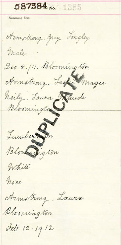 Parents Father: ARMSTRONG, Leslie Magee Mother: NEILY, Laura Maude Birth Born on December 08, 1911 in Bloomington, Annapolis Co., NS Death Died on October 22, 1938 in Middleton, Annapolis Co., NS Buried in Nictaux Cemetery in Nictaux, Annapolis Co., NS Marriages MACKINNON, Henrietta Married on September 22, 1934 in Nictaux Falls, Annapolis Co., NS Notes Occupation: Farmer Death: Acute Appendicitis/ General Peritonitis Sources Nova Scotia Deaths: Year 1938 File 176 #189 Images Guy Armstrong Birth Leslie & Laura (Neily) Armstrong,Guy & Henrietta (MacKinnon) Armstrong,Walker Armstrong Guy Armstrong Death Guy Armstrong Marriage