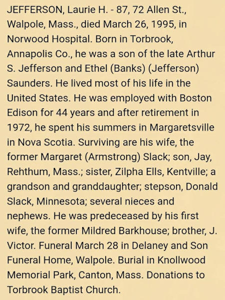 Birth Born on June 18, 1907 in Torbrook Mines, Annapolis Co., NS Death Died on March 26, 1995 in Norwood, Norfolk Co., MA Buried in Knollwood Memorial Park in Canton, Norfolk Co., MA Marriages ARMSTRONG, Margaret Odessa Sources Massachusetts Deaths: #023298 Images Laurie Jefferson Birth Laurie Jefferson Obit