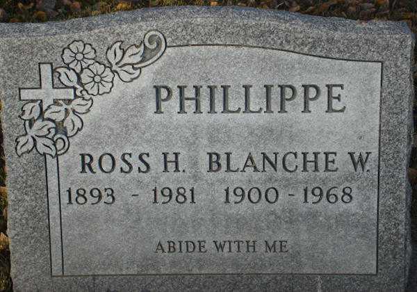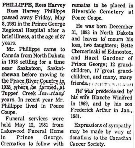 Birth Born on December 31, 1893 in Walhalla, Pembina Co., ND Death Died on May 08, 1981 in Prince George, Fraser-Fort George Region, BC Buried in River View Cemetery in Pouce Coupe, Peace River Region, BC Marriages SCHAFFNER, Blanche Winnifred Children PHILLIPPE, Bette G. PHILLIPPE, Frederick Arthur: May 02, 1922 - January 10, 1981 PHILLIPPE, Hazel Irene: January 05, 1924 - June 16, 2003 Notes Occupation: Farmer Death: Cardiac Asystole Sources BC Deaths: 81-09-008238 Images Ross & Blanche (Schaffner) Phillippe Ross Phillippe Death Ross Phillippe Obit