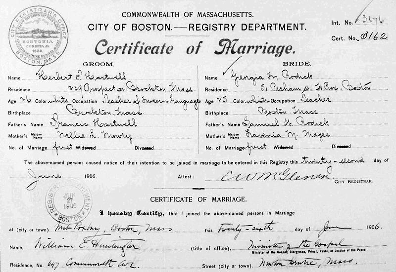 Parents Father: RODICK, Samuel W. Mother: MAGEE, Lavenia Maria Birth Born on September 02, 1880 in Boston, Suffolk Co., MA Death Died on June 01, 1928 in Boston, Suffolk Co., MA Buried in Newton Cemetery in Newton, Middlesex Co., MA Marriages HARTWELL, Herbert Francis Married on June 26, 1906 in West Roxbury, Suffolk Co., MA Children HARTWELL, Hope: May 07, 1908 - March 02, 1996 HARTWELL, Herbert Roger: January 10, 1910 - December 22, 1992 HARTWELL, Constance Georgia: January 05, 1912 HARTWELL, Priscilla Frances: October 08, 1913 - November 04, 2007 HARTWELL, Patience Roberta: September 29, 1915 - September 23, 2010 Notes Occupation: Teacher Sources Newspaper Obituary: Boston Herald Boston,MA June 2,1928 Images Georgia Rodick Birth Georgia (Rodick) Hartwell & Priscilla Hartwell Georgia Rodick Marriage