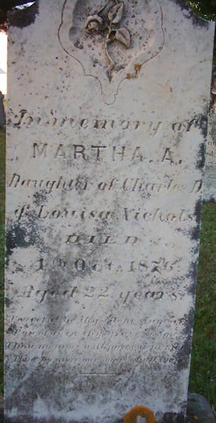 Parents Father: NICHOLS, Charles Dodge Mother: PALMER, Louisa Birth Born on 1854 in Aylesford, Kings Co., NS Death Died on October 04, 1876 in Aylesford, Kings Co., NS Buried in Aylesford Old United Cemetery in Aylesford, Kings Co., NS Notes Death: Consumption Sources Nova Scotia Deaths: Book 1811 Pg. 142 #240 Images Martha Nichols Martha Nichols Death