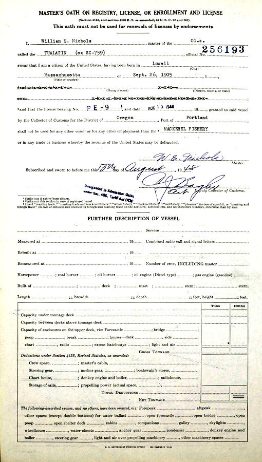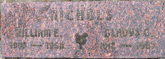 Parents Father: NICHOLS, Elijah M. Mother: POLAND, Nellie Mariah Birth Born on September 26, 1905 in Lowell, Middlesex Co., MA Death Died on April 19, 1968 in Portland, Multnomah Co., OR Buried in Oswego Pioneer Cemetery in Lake Oswego, Clackamas Co., OR Marriages HALL, Gladys Cleo Children NICHOLS, Robert Elliott: July 26, 1942 NICHOLS, Carol Ann: September 06, 1943 - October 02, 2011 NICHOLS, Richard P.: October 15, 1950 NICHOLS, Roger C.: July 04, 1955 Notes Occupation: Employee at Acme Refrigeration Co./ Ship Captain Sources Oregon Deaths: #5832 Images William E. Nichols Birth William E. & Gladys (Hall) Nichols William E. Nichols WW2 Draft William E. Nichols Ship Licensing