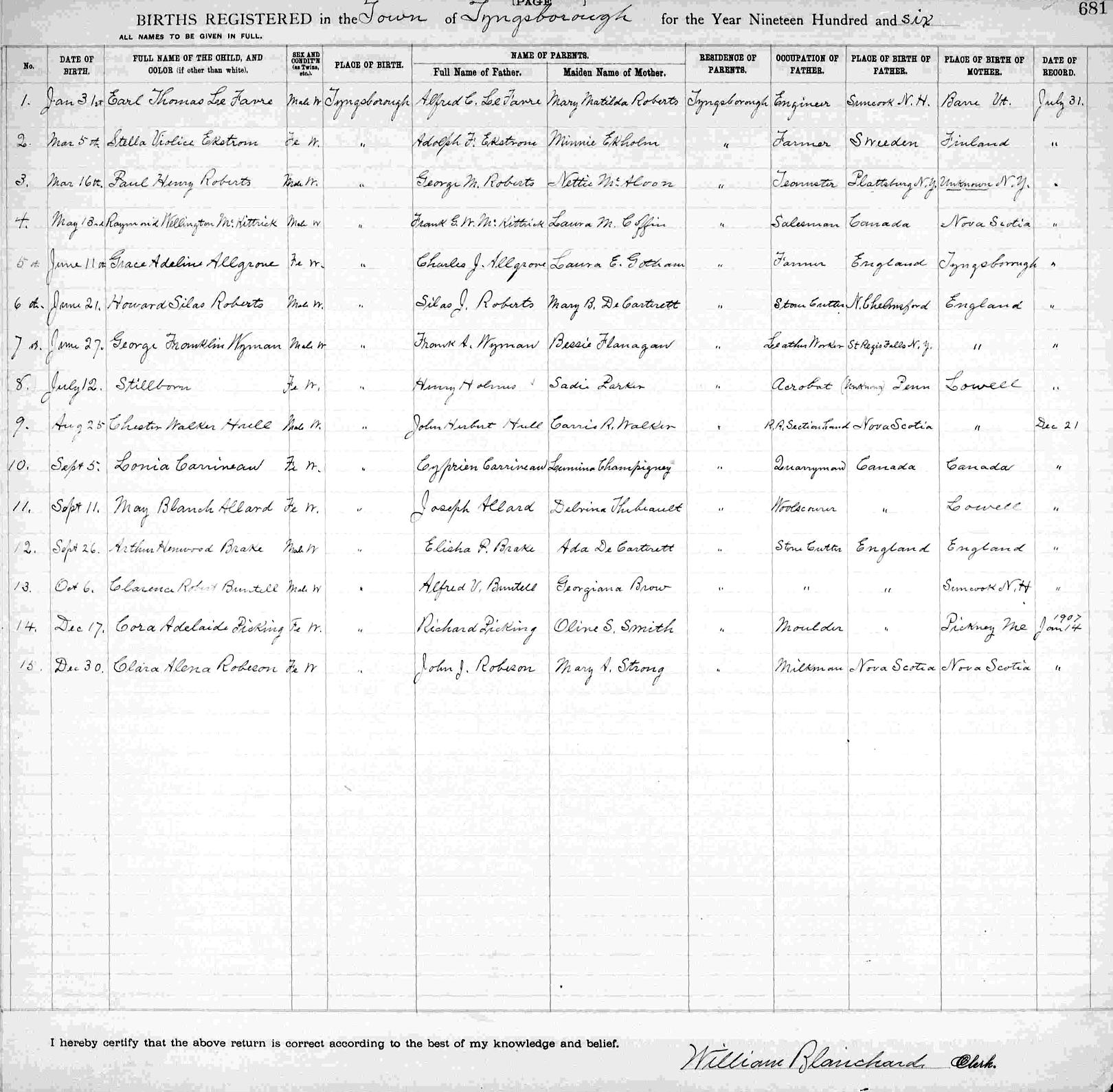 Parents Father: McKITTRICK, Francis George Wellington Mother: COFFIN, Laura Mae Birth Born on May 13, 1906 in Tyngsborough, Middlesex Co., MA Death Died on March 15, 1994 in Needham, Norfolk Co., MA Buried in Lowell Cemetery in Lowell, Middlesex Co., MA Marriages STENGEL, Lorraine Elinor Notes Occupation: Manager Textile Machines Sources Massachusetts Deaths: #024630 Images Raymond McKittrick Birth Francis & Laura (Coffin) & Bertrand & Harriet (Meister) McKittrick,Robert & Georgia (McKittrick) Wilson,Raymond & Lorraine (Stengel) & Carl & Maxine (Bowen) McKittrick