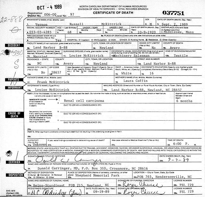 Parents Father: McKITTRICK, Francis George Wellington Mother: COFFIN, Laura Mae Birth Born on October 09, 1920 in Lowell, Middlesex Co., MA Death Died on September 02, 1989 in Newland, Avery Co., NC Buried in Crossnore Presbyterian Church Cemetery in Crossnore, Avery Co., NC Marriages MARTIN, Louise Marion Married on 1943 in Lowell, Middlesex Co., MA Children McKITTRICK, Paula: July 29, 1946 McKITTRICK, Dana Charles: January 22, 1948 Notes Military Service: WW2 US Army Air Corps Lieutenant Navigator of B-17 Bombers Occupation: Salesman Textile Machinery Death: Renal Cell Carcinoma Sources North Carolina Deaths: #37751 Images Vernon McKittrick Birth Vernon McKittrick Vernon McKittrick Death Louise (Martin) & Vernon McKittrick