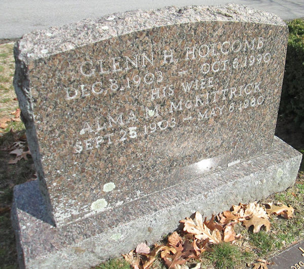 Birth Born on December 08, 1903 in Alburg, Grand Isle Co., VT Death Died on October 06, 1990 in Chelmsford, Middlesex Co., MA Buried in Pine Ridge Cemetery in Chelmsford, Middlesex Co., MA Marriages McKITTRICK, Alma Maud Children HOLCOMB, Marilyn L.: July 01, 1938 - April 04, 2022 Notes Occupation: Clerk/ Office Manager Sources Massachusetts Deaths: #048029 Images Glendon Holcomb Birth Glenn & Alma (McKittrick) Holcomb