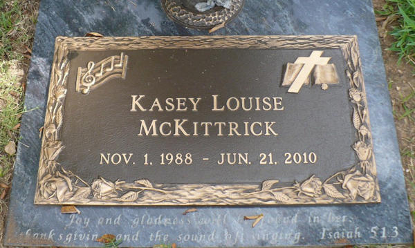 Parents Father: McKITTRICK, Dana Charles Mother: JONES, Vicki Birth Born on November 01, 1988 in Charlotte, Meckleburg Co., NC Death Died on June 21, 2010 in Linville, Avery Co., NC Buried in Magnolia Memorial Gardens - Calvary Church in Charlotte, Meckleburg Co., NC Notes Obituary: Kasey Louise McKittrick God needed an angel and called Kasey home to be with her Lord and Saviour on Monday, June 21, 2010 in Cannon Memorial Hospital in Linville, NC. A Charlotte native, she was born November 1, 1988. Kasey graduated from United Faith Christian Academy and Lees-McRae College where she received her BA in Performing Arts Studies. She was a member of the Alpha Psi Omega, a theatre honor fraternity. Kasey did an internship with NarroWay Productions and was also in productions of ImaginOn, a collaborative venture of the Public Library of Charlotte and Mecklenburg County and the Children's Theater of Charlotte. She loved being in the mountains, but also loved the beach and Lake Norman. Kasey loved the theatre, music and singing. In her spare time she loved to work jigsaw puzzles. She also loved spending time with her family and friends. Kasey will be greatly missed. Kasey was preceded in death by her maternal grandparents Foster and Nena Jones; paternal grandfather Vernon McKittrick and her uncle Eddie Jones. Survivors include her parents, Dana and Vicki McKittrick; brother, Kyle McKittrick and Katie Brunjes; paternal grandmother, Louise McKittrick. Also surviving are her aunts and uncles, Ron and Debbie Jones, Debbie and Steve Meggs, Paula Korber and many cousins. A service to celebrate Kasey's life will be held 11:00 AM Friday, June 25, 2010 in the Chapel of Calvary Church, 5801 Pineville-Matthews Road Charlotte, NC. Interment will follow in Magnolia Memorial Gardens. The family will receive friends Thursday evening from 7:00 to 8:30 PM at Hankins & Whittington Funeral Service. The family would like to offer a special thanks and appreciation to the Land Harbor Police Chief, Chris Willis, the Linville Volunteer Fire Department and to the hospital emergency room staff and doctors for their courageous efforts. In lieu of flowers the family requests that memorials be made to Gethsemane Garden Christian Centre, P O Box 472804, Charlotte, NC 28247, Scholarship Fund at United Faith Christian Academy, 8617 Providence Rd, Charlotte, NC 28277 or Lees-McRae College Fund, PO Box 128, Banner Elk, NC 28604 Sources Cemetery: Magnolia Memorial Gardens - Calvary Church Charlotte,NC Images Kasey McKittrick Kasey McKittrick