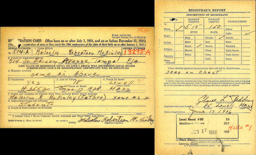Parents Father: McKINLEY, Malcolm Robertson Mother: NICHOLS, Evelyn Ola Louise Birth Born on June 17, 1928 in Lowell, Middlesex Co., MA Death Died on September 29, 2012 in Babson Park, Polk Co., FL Buried in Cremated Marriages THOMPSON, Virginia Married on 1950 in Tampa, Hillsborough Co., FL Children McKINLEY, James Malcolm McKINLEY, Girl: September 01, 1953 - September 01, 1953 McKINLEY, Richard A.: November 01, 1955 McKINLEY, William Thompson: 1960 Notes Obituary: Malcolm Robertson "Mac" McKinley, Jr died in his sleep at home Saturday, September 29, 2012 after a long term illness. Mac was born June 17, 1928 in Lowell, Massachusetts to Malcolm and Ola McKinley. His family moved to Tampa, Florida where he grew up and graduated from Plant High School. He attended Amherst College, then the University of Florida, where he graduated with degrees in English and Agriculture. He served as a lieutenant in the United States Navy during the Korean War. Mr. McKinley ("Mr. Mac") had a lifelong interest in Agriculture and worked in the citrus industry for over fifty years. After the war and his graduated from UF, he went to work at the Citrus Experiment Station in Lake Alfred and then became a shareholder and manager of Highland Park Service Company in Lake Wales. He participated in industry efforts and associations over the years, including his membership and service as president of the Lake Wales Citrus Growers Association . He was a man of few words. An avid sailor and fisherman, lifelong student and accomplished pianist, Mac was a great father, husband, grandfather and friend. He is survived by sons, Jim, Richard and Bill McKinley; sister, Louise Brown; brother, Donald McKinley; former wife, Virginia McKinley; grandchildren, Donpaul, Sara, Jesse, Sam, Logan and Hannah; step-children, Robert Pohle, Mimi Riser, Terry Dolbier, Ken Isoma and Kim Deme; and step-grandchildren, Zachary , Nicholas, Cassandra, Amber, Alex and Andrew. Services will be held 2:00 pm Wednesday, October 3, 2012 at the Babson Park Community Church. The family will greet friends at the church beginning at 1:00 pm. Donations in lieu of flowers may be made to the UF Center for Movement Disorders (3450 Hull Road, Fourth Floor, Gainesville, Florida 32607). Military Service: Korea US Navy Lieutenant Occupation: Shareholder & Manager Highland Park Service Co. Sources Obituary: Polk Co.,FL October 2012 Images Malcolm McKinley Jr Draft