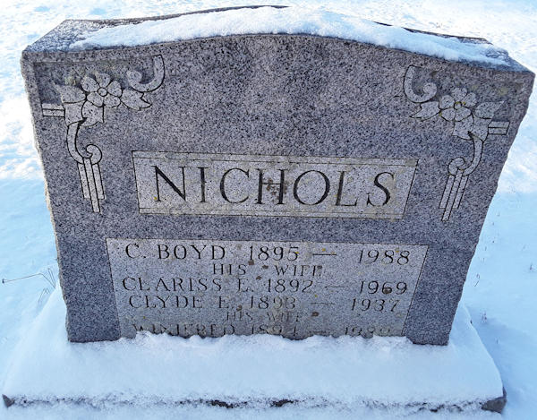 Parents Father: NICHOLS, Jeremiah Isaac Mother: WEST, Clara Alice Birth Born on December 08, 1893 in Nicholsville, Kings Co., NS Death Died on August 22, 1937 in Halifax, Halifax Regional Municipality, NS Buried in Aylesford Union Cemetery in Aylesford, Kings Co., NS Marriages WARNE, Winifred Married on 1917 in Rochford, Essex, England Children NICHOLS, Clara Joyce: September 14, 1918 - February 07, 1995 NICHOLS, Laura LeMoine: 1921 NICHOLS, Benjamin Charles: June 18, 1923 - March 08, 2013 NICHOLS, Roderick Clyde: June 15, 1925 - February 14, 2013 NICHOLS, Geraldine Myrtle: 1928 Notes Death: Gangrene of Foot/ Diabetes Occupation: Farmer/ Electric Engineer Military Service: WW1 CEF Sources Nova Scotia Deaths: Year 1937 File 169 #523 Images Charles B. & Clariss (Broomfield) Nichols & Clyde & Winifred (Warne) Nichols Clyde Nichols Death Clyde Nichols