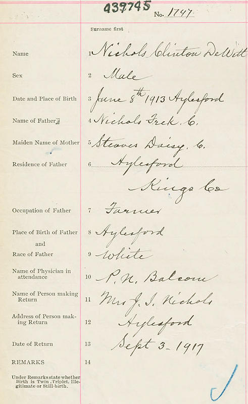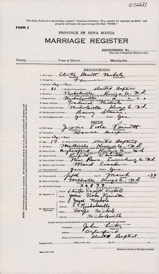 Parents Father: NICHOLS, Frederick Clinton Mother: STEEVES, Daisy K. Birth Born on June 08, 1913 in Aylesford, Kings Co., NS Death Died on December 07, 1990 in Tatamagouche, Colchester Co., NS Buried in The Falls Cemetery in The Falls, Colchester Co., NS Marriages VEINOTT, Jessie Viola Married on March 05, 1934 in Millville, Kings Co., NS Children NICHOLS, Barbara NICHOLS, Maxine NICHOLS, Anne Mae: January 27, 1936 - July 26, 2018 NICHOLS, Shirley Irene: July 17, 1937 - November 19, 2018 NICHOLS, Russell A.: 1940 - 1984 NICHOLS, Margaret Elizabeth: May 08, 1943 - March 22, 2016 NICHOLS, Freddie Rupert: December 07, 1944 - 1968 Sources Findagrave.com: https://www.findagrave.com/memorial/155761574/clinton_dewitt-nichols Images Clinton Nichols Birth Clinton & Jessie (Veinott) Nichols George Nichols Marriage