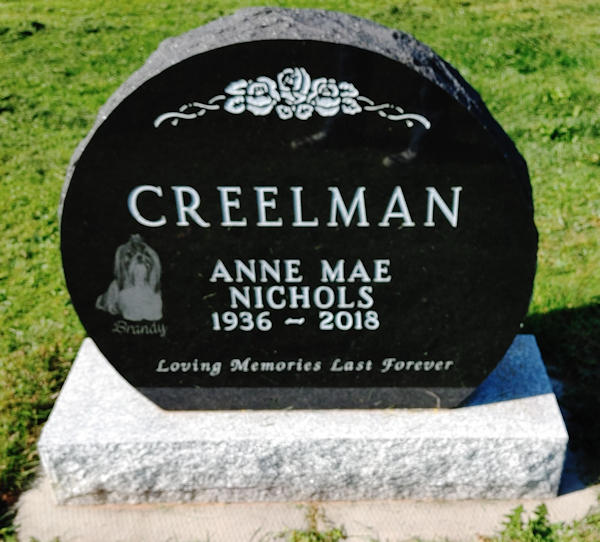 Parents Father: NICHOLS, Clinton Dewitt Mother: VEINOTT, Jessie Viola Birth Born on January 27, 1936 in Aylesford, Kings Co., NS Death Died on July 26, 2018 in Truro, Colchester Co., NS Buried in Fisher Creek Cemetery in Green Oaks, Colchester Co., NS Marriages CREELMAN, William Noble Children CREELMAN, Deborah CREELMAN, Carolyn CREELMAN, Crystal CREELMAN, Joyce Marie: May 15, 1956 - June 04, 1958 Notes Obituary: Creelman, Anne Mae \endash 82, Bible Hill, passed away on July 26, 2018 in the Colchester East Hants Health Centre, Truro. Born in Aylesford, Kings Co., to the late Clinton and Jessie Nichols. Anne enjoyed gardening, baking and sewing. She loved to dance and listen to music. She had an art of making a house a home. Surviving are daughters, Debbie Miller, Langley, BC, Carolyn Creelman, Truro, Crystal Lauther, Bible Hill; grandchildren, Ann-Marie and Kathy Miller, Both of Surrey, BC, Tyler Creelman, Dartmouth, Brody and Alexis Lauther, Bible Hill; great grandchildren, Robert, Brooklyn and Payton; sister, Shirley Cameron, Balfron, Barbara Penny, Truro, Maxine Mann, ON. Anne is predeceased by her daughter, Joyce Marie; sister, Margaret Langille; brothers, Russell and Freddy Nichols. Visitation will be held from 1-2 p.m. on Monday, July 30 with service at 2 p.m., both in Colchester Community Funeral Home, 512 Willow Street, Truro. Interment will take place in Fisher Creek Cemetery, following the service. Donations in memory may be made to the Heart and Stroke Foundation of Nova Scotia. Condolences may be made by visiting www.ColchesterCommunity.com Sources Funeral Home: Colchester Community Funeral Home Truro,NS Obituary July 2018 Images Anne (Nichols) Creelman Anne Nichols