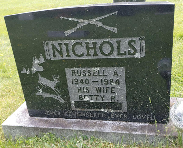 Death Buried in The Falls Cemetery in The Falls, Colchester Co., NS Marriages NICHOLS, Russell A. Children NICHOLS, Daphne Ethel: January 27, 1968 - March 14, 1969 NICHOLS, Derek Russell: February 17, 1970 - June 28, 2004 Images Russell & Betty Nichols