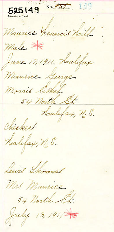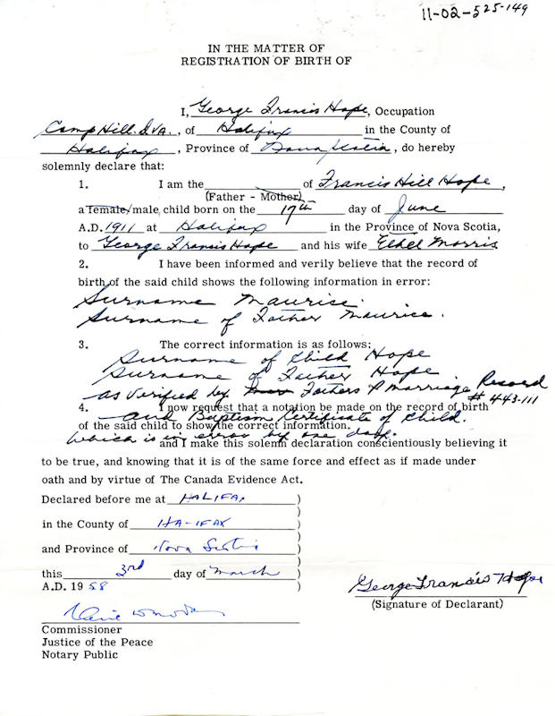 Birth Born on June 17, 1911 in Halifax, Halifax Regional Municipality, NS Death Died on October 18, 1985 in Halifax, Halifax Regional Municipality, NS Buried in Fairview Lawn Cemetery in Halifax, Halifax Regional Municipality, NS Marriages NICHOLS, Florence Iona Married on February 26, 1943 in Halifax, Halifax Regional Municipality, NS Notes Occupation: Pharmacist Sources Findagrave.com: https://www.findagrave.com/memorial/270998286/frank-hope Images Francis Hope Birth1 Francis Hope Birth Florence Nichols Marriage