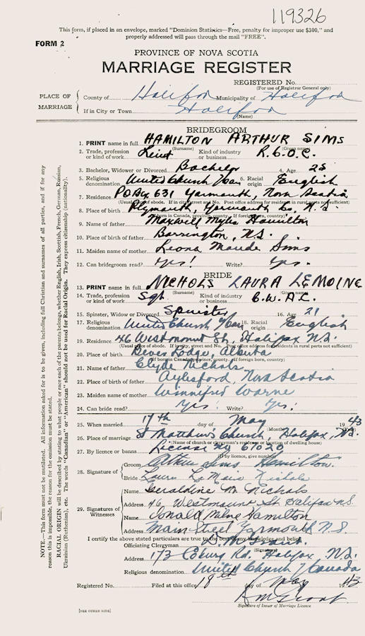 Parents Father: NICHOLS, Clyde Everett Mother: WARNE, Winifred Birth Born on 1921 in Beaverlodge, Grande Prairie Co., AB Marriages HAMILTON, Arthur Sims Married on May 17, 1943 in Halifax, Halifax Regional Municipality, NS Notes Military Service: WW2 CWAC Sergeant Images Laura Nichols Marriage