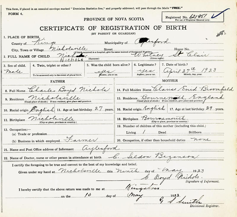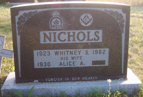 Parents Father: NICHOLS, Charles Boyd Mother: BROOMFIELD, Clariss Enid Birth Born on April 27, 1923 in Nicholsville, Kings Co., NS Death Died on May 27, 1982 in Kings Co., NS Buried in Aylesford Union Cemetery in Aylesford, Kings Co., NS Marriages ROBERTS, Alice Alberta Married on September 04, 1947 in Waterville, Kings Co., NS Children NICHOLS, Robert Charles: January 16, 1948 - April 15, 2020 NICHOLS, Roy Albion: April 09, 1951 - October 08, 2016 Sources Findagrave.com: https://www.findagrave.com/memorial/107539527/whitney_st_clair-nichols Images Whitney Nichols Birth Whitney & Alice (Roberts) Nichols Whitney Nichols Marriage