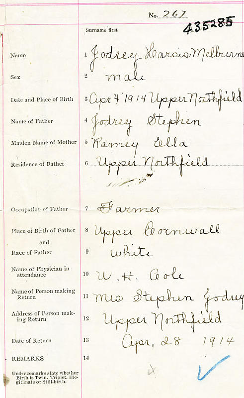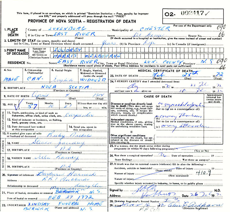 Birth Born on April 04, 1914 in Upper Northfield, Lunenburg Co., NS Death Died on February 25, 1972 in East River, Lunenburg Co., NS Buried in Morristown Cemetery in Morristown, Kings Co., NS Marriages NICHOLS, Ruby Maude Married on December 16, 1939 in Aylesford, Kings Co., NS Notes Occupation: Farmer/ Carpenter Death: Myocardial Infarction Sources Nova Scotia Deaths: Year 1972 #2417 Images Harris Joudrey Birth Harris & Ruby (Nichols) Joudrey Harris Joudrey Death Ruby Nichols Marriage