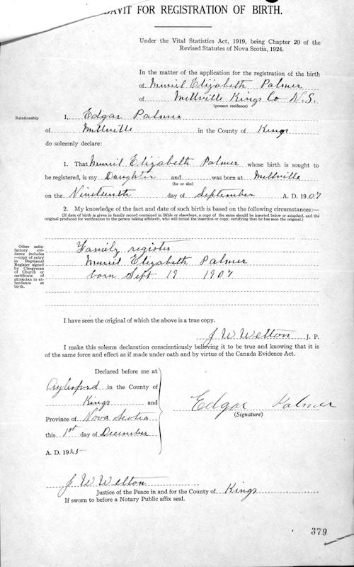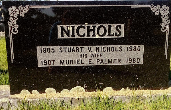 Parents Father: PALMER, Edgar Burton Mother: EWING, Bessie Estella Birth Born on September 19, 1907 in Millville, Kings Co., NS Death Died on July 27, 1980 in Kings Co., NS Buried in Morristown Cemetery in Morristown, Kings Co., NS Marriages NICHOLS, Stuart Vaughn Married on September 24, 1930 in Morristown, Kings Co., NS Children NICHOLS, Vaughn Stuart: April 02, 1932 - February 05, 2019 Notes Occupation: Teacher Sources Findagrave.com: https://www.findagrave.com/memorial/107541516/muriel-elizabeth-nichols Images Muriel Palmer Birth Stuart & Muriel (Palmer) Nichols Stuart Nichols Marriage