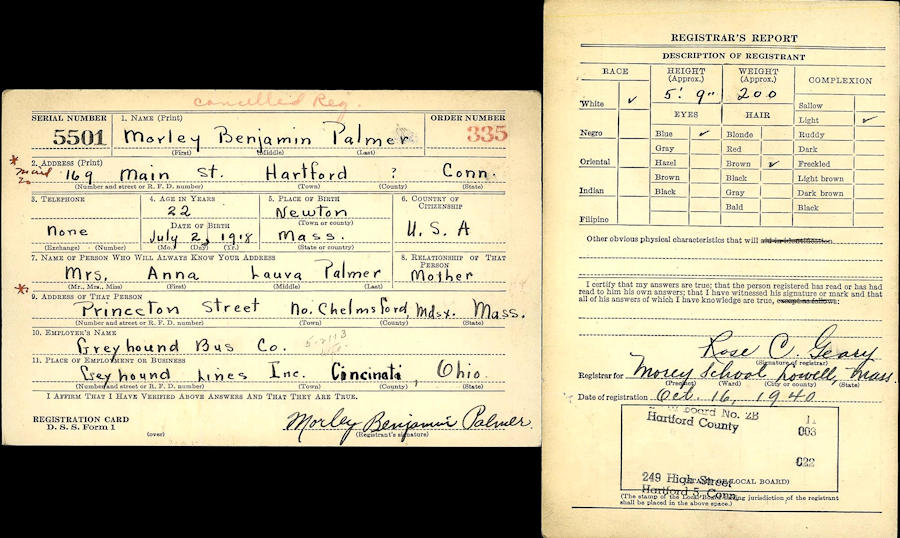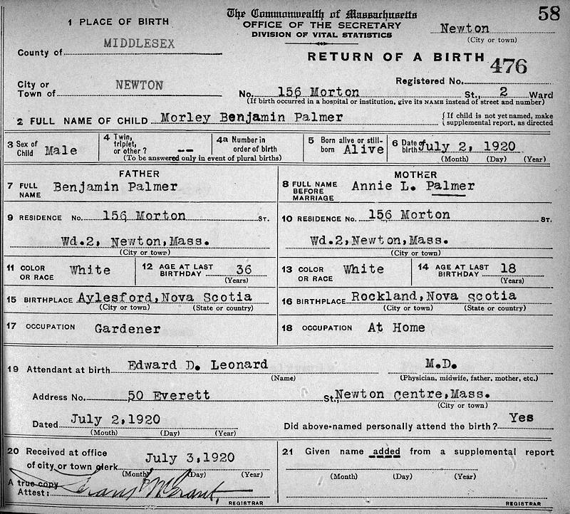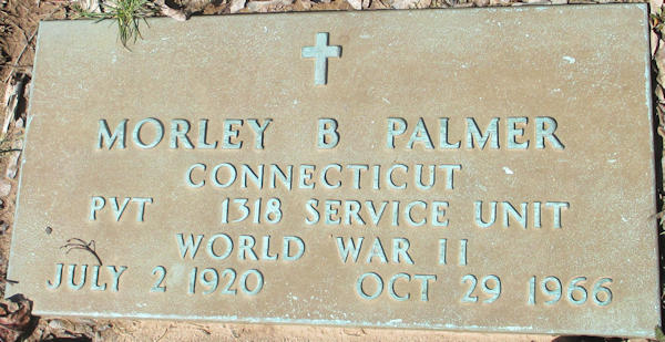 Parents Father: PALMER, Benjamin Clifford Mother: PALMER, Anna Laura Birth Born on July 02, 1920 in Newton, Middlesex Co., MA Death Died on October 29, 1966 in New York, USA Buried in Rose Hill Memorial Park in Rocky Hill, Hartford Co., CT Marriages CURLEE, Frances Marion Children PALMER, Gerald Michael: May 19, 1950 - December 20, 2004 PALMER, Sharon Leigh: November 20, 1956 Notes Military Service: WW2 US Army Occupation: Bus Driver Greyhound Bus Co. Images Morley Palmer Birth Morley Palmer Morley Palmer WW2 Draft