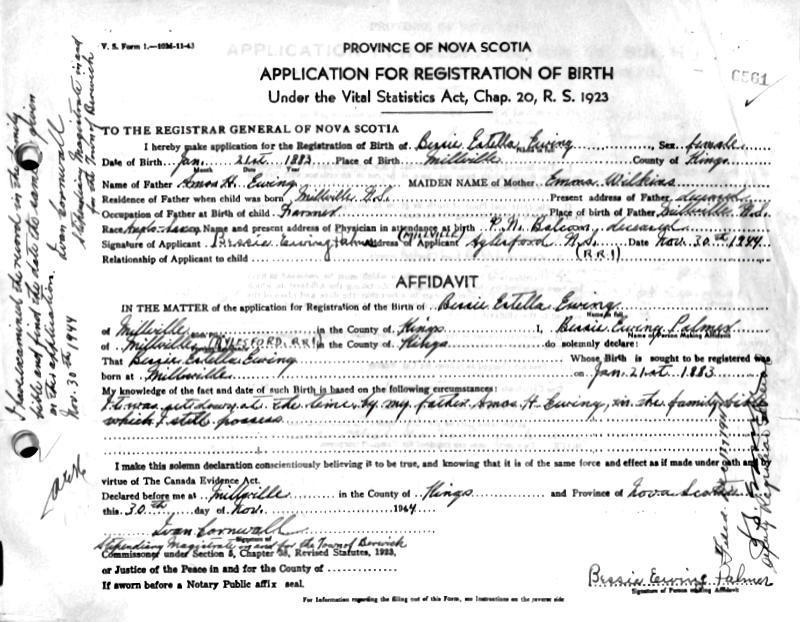 Birth Born on January 21, 1883 in Millville, Kings Co., NS Death Died on May 06, 1971 in Berwick, Kings Co., NS Buried in Aylesford Union Cemetery in Aylesford, Kings Co., NS Marriages PALMER, Edgar Burton Married on November 16, 1904 in Millville, Kings Co., NS Children PALMER, Claude W.: January 19, 1906 - May 21, 1988 PALMER, Muriel Elizabeth: September 19, 1907 - July 27, 1980 PALMER, Hazel B.: July 12, 1909 - December 24, 1976 PALMER, Vernon Handley: April 10, 1910 - March 28, 1997 Notes Death: Chronic Renal Failure Sources Nova Scotia Deaths: Year 1971 #3441 Images Bessie Ewing Birth Bessie (Ewing) Palmer Death Edgar Palmer Marriage
