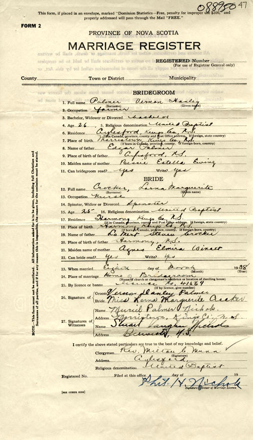 Parents Father: PALMER, Edgar Burton Mother: EWING, Bessie Estella Birth Born on April 10, 1910 in Factorydale, Kings Co., NS Death Died on March 28, 1997 in Kentville, Kings Co., NS Buried in Aylesford Union Cemetery in Aylesford, Kings Co., NS Marriages CROCKER, Lorna Marguerite Married on March 08, 1938 in Aylesford, Kings Co., NS Children PALMER, Milton PALMER, Linda Notes Occupation: Farmer Obituary: PALMER, Vernon Hanley - 85, Millville, Kings Co., died March 28, 1997, in Valley Regional Hospital, Kentville. Born in Factorydale, Kings Co., he was a son of the late Edgar and Bessie (Ewing) Palmer. He had owned and operated his own mixed farm in Millville, retiring in 1977. He was the last surviving member of his immediate family. Surviving are son, Milton, Millville; daughter, Linda (Mrs. Chesley Shave), Dartmouth; four grandchildren; several nieces and nephews. He was predeceased by his wife, Lorna M. (Crocker); brother, Claude; sisters, Muriel Nichols, Hazel Lowder. Visitation 7-9 p.m. today, funeral 2 p.m. Tuesday, both in H.C. Lindsay Memorial Chapel, Berwick, Rev. Wayne Schurman officiating. Burial in Aylesford Union Cemetery. Family flowers only. Donations to Parkinson's Foundation of Canada, Nova Scotia Division; Heart and Stroke Foundation of Nova Scotia or any charity. Sources Funeral Home: H.C. Lindsay Memorial Chapel Berwick,NS Obituary March 1997 Images Vernon Palmer Birth Vernon Palmer Marriage