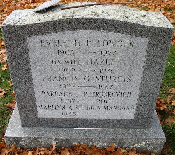 Parents Father: PALMER, Edgar Burton Mother: EWING, Bessie Estella Birth Born on July 12, 1909 in Millville, Kings Co., NS Death Died on December 24, 1976 in Worcester, Worcester Co., MA Buried in Mountain View Cemetery in Shrewsbury, Worcester Co., MA Marriages LOWDER, Eveleth P. Children LOWDER, Marilyn A.: May 07, 1935 LOWDER, Barbara Joan: February 06, 1937 - December 29, 2015 Sources Massachusetts Deaths: #054941 Images Eveleth & Hazel (Palmer) Lowder,Francis Sturgis,Barbara (Lowder) Petroskovich,Marilyn (Lowder) Mangano