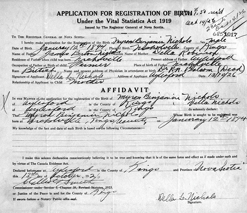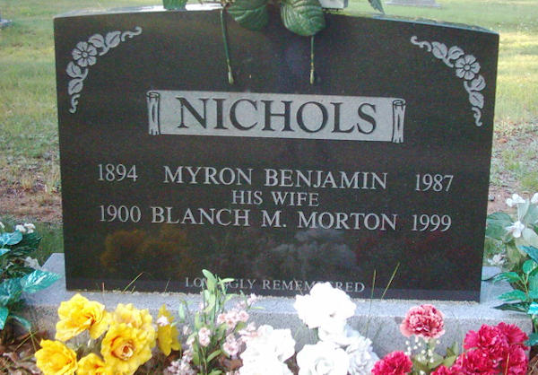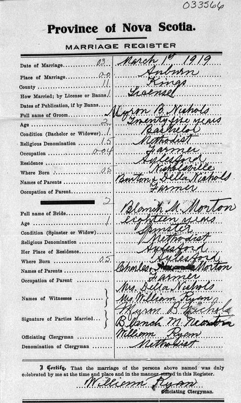 Parents Father: NICHOLS, James Burton Mother: ROBINSON, Della L. Birth Born on January 12, 1894 in Nicholsville, Kings Co., NS Death Died on December 10, 1987 in Aylesford, Kings Co., NS Buried in Aylesford Union Cemetery in Aylesford, Kings Co., NS Marriages MORTON, Blanche Marie Married on March 01, 1919 in Auburn, Kings Co., NS Children NICHOLS, Ambrose Roy: January 02, 1920 - October 28, 2003 NICHOLS, Laird Morton: 1927 - October 18, 2008 NICHOLS, Garth Burton: October 18, 1929 - February 06, 2022 NICHOLS, Evangeline: August 03, 1931 - March 15, 2024 Notes Occupation: Farmer Sources Findagrave.com: https://www.findagrave.com/memorial/107501380/myron_benjamin-nichols Images Myron Nichols Birth Myron & Blanch (Morton) Nichols Myron Nichols Marriage