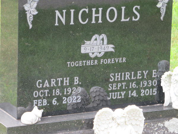 Parents Father: NICHOLS, Myron Benjamin Mother: MORTON, Blanche Marie Birth Born on October 18, 1929 in Aylesford, Kings Co., NS Death Died on February 06, 2022 in Willington, Tolland Co., CT Buried in Willington Hill Cemetery in Willington, Tolland Co., CT Marriages LUTZ, Shirley Elizabeth Married on September 17, 1949 in Aylesford, Kings Co., NS Children NICHOLS, Eric Garth: August 16, 1957 Notes Occupation: Farmer Sources Cemetery: Willington Hill Cemetery Willington,CT Images Garth & Shirley (Lutz) Nichols Garth Nichols Marriage