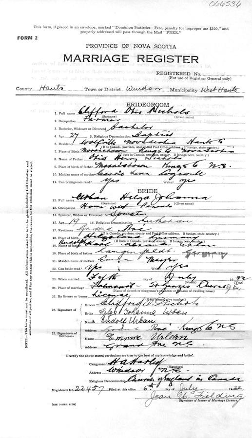 Birth Born on September 20, 1912 in Heligoland, Germany Death Died on January 09, 2006 in Port Hope, Northumberland Co., ON Marriages NICHOLS, Clifford Otis Married on July 05, 1932 in Falmouth, Hants Co., NS Sources Mormons: https://www.familysearch.org/en/tree/person/details/LLS9-GRW Images Clifford Nichols Marriage