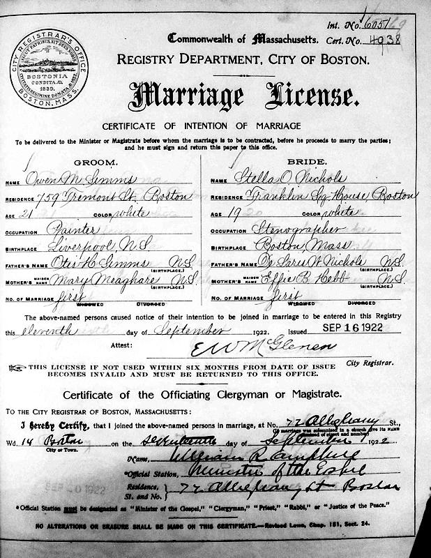 Birth Born on April 02, 1901 in Liverpool, Queens Co., NS Death Died on January 28, 1991 in Harwich, Barnstable Co., MA Buried in Mount Pleasant Cemetery in Harwich Port, Barnstable Co., MA Marriages NICHOLS, Stella Olivia Married on September 17, 1922 in Boston, Suffolk Co., MA Children SIMMS, Boy: September 02, 1923 - September 02, 1923 SIMMS, Lawrence Owen: December 15, 1924 - January 03, 1987 SIMMS, Barbara E.: 1929 Notes Occupation: Painter/ Truckman/ Paper Hanger Sources Massachusetts Deaths: #013593 Images Owen Simms Stella Nichols Marriage