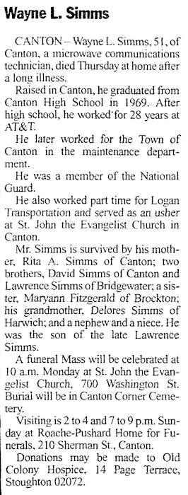 Parents Father: SIMMS, Lawrence Owen Mother: CARNEY, Rita Anne Birth Born on October 01, 1950 in Boston, Suffolk Co., MA Death Died on April 11, 2002 in Canton, Norfolk Co., MA Buried in Canton Corner Cemetery in Canton, Norfolk Co., MA Marriages , Renelle Jeanne Notes Occupation: Employee at AT&T/ Town of Danton Maintenance Dept. Military Service: Massachusetts National Guard Images Wayne Simms Obit The Patriot Ledger Quincy,MA Apr 13, 2002