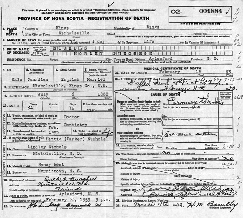Parents Father: NICHOLS, Lindley Moore Mother: BENT, Nancy M. Birth Born on July 06, 1888 in Nicholsville, Kings Co., NS Death Died on February 18, 1953 in Nicholsville, Kings Co., NS Buried in Aylesford Union Cemetery in Aylesford, Kings Co., NS Marriages PARKER, Hettie Eaton Married on July 11, 1917 in Belleisle, Annapolis Co., NS Children NICHOLS, Frances LaVaughn: June 18, 1919 NICHOLS, Phyllis Jeanette: June 01, 1922 - July 18, 2014 NICHOLS, Thelma Bernice: March 22, 1926 - April 09, 2009 Notes Occupation: Dentist Death: Coronary Thrombosis Sources Nova Scotia Deaths: Year 1953 #1884 Images Morley Nichols Death Morley Nichols Marriage