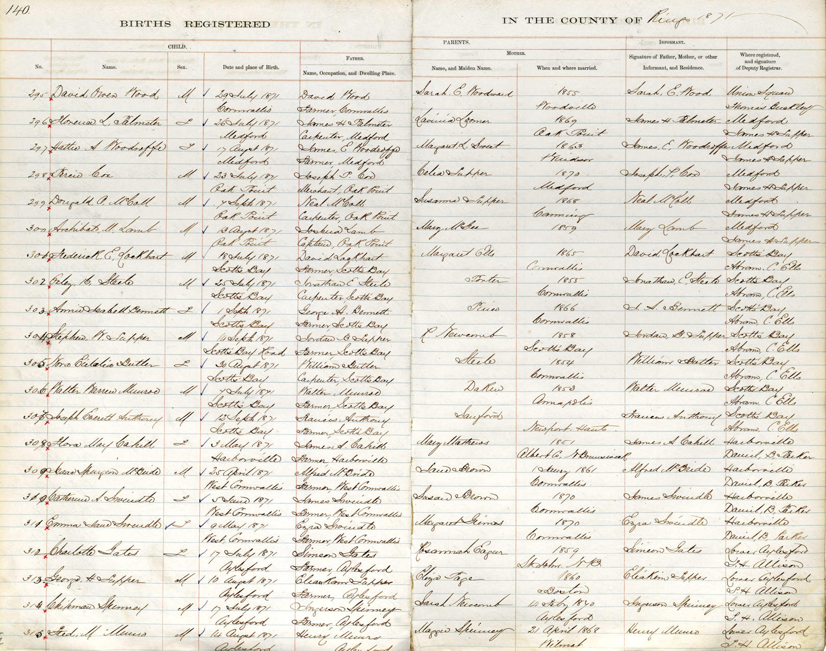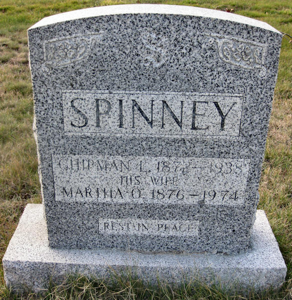 Birth Born on July 17, 1871 in Aylesford, Kings Co., NS Death Died on September 27, 1937 in Greenwood, Kings Co., NS Buried in Greenwood Union Church Cemetery in Greenwood, Kings Co., NS Marriages NICHOLS, Martha Odessa Married on December 02, 1896 in Nicholsville, Kings Co., NS Children SPINNEY, Bessie Vonetta: May 24, 1897 - May 10, 1965 SPINNEY, Erdeena Bernice: October 02, 1900 - March 31, 1959 SPINNEY, Muriel Odessa: February 13, 1907 - May 19, 2010 SPINNEY, Clinton Moore: January 23, 1915 - March 05, 1994 Notes Occupation: Farmer Death: Angina pectoris Sources Nova Scotia Deaths: Year 1937 File 173 #166 Images Chipman Spinney Birth Chipman & Martha (Nichols) Spinney Chipman Spinney Death Martha Nichols Marriage