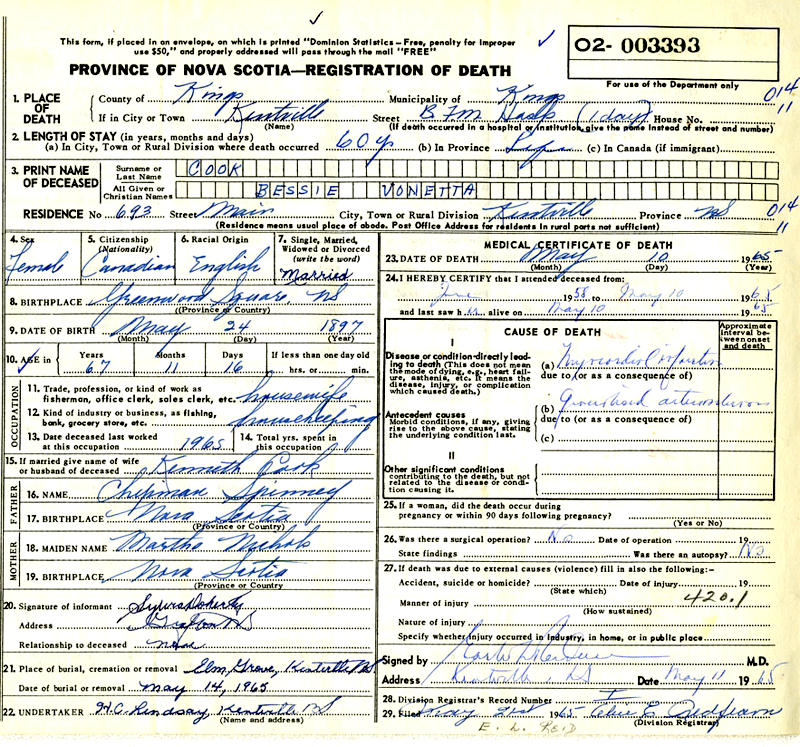 Parents Father: SPINNEY, Chipman LaVerne Mother: NICHOLS, Martha Odessa Birth Born on May 24, 1897 in Greenwood, Kings Co., NS Death Died on May 10, 1965 in Kentville, Kings Co., NS Buried in Elm Grove Cemetery in Steam Mill, Kings Co., NS Marriages COOK, Kenneth Sutherland Married on November 08, 1922 in Greenwood, Kings Co., NS Children COOK, Pansy Marie: 1925 - 1982 COOK, Helen Joyce: 1928 - 1976 Notes Occupation: Teacher Death: Myocardial Infarction Sources Nova Scotia Deaths: Year 1965 #3393 Images Kenneth & Bessie (Spinney) Cook Bessie (Spinney) Cook Death Bessie Spinney Marriage