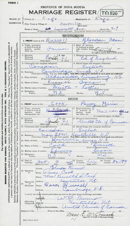Parents Father: COOK, Kenneth Sutherland Mother: SPINNEY, Bessie Vonetta Birth Born on 1925 in Kentville, Kings Co., NS Death Died on 1982 in Kentville, Kings Co., NS Buried in Elm Grove Cemetery in Steam Mill, Kings Co., NS Marriages RUSSELL, Glendon Oden Married on October 09, 1946 in Kentville, Kings Co., NS Children RUSSELL, Allan RUSSELL, Eric RUSSELL, Deborah RUSSELL, Kenneth A.: 1952 - 2006 Notes Occupation: Clerk Mail Order Office Sources Kings Cemetery Records: Elm Grove Cemetery Steam Mill,NS Images Glendon & Pansy (Cook) & Kenneth Russell Pansy Cook Marriage