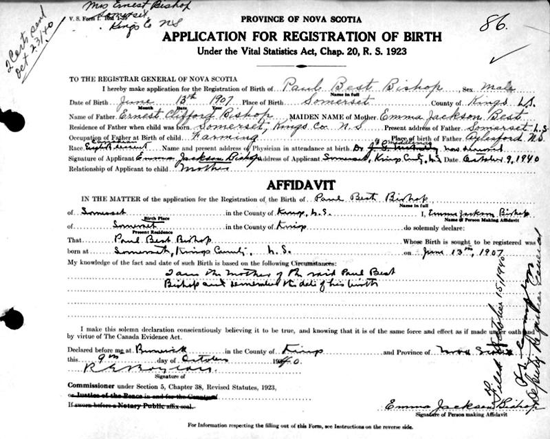 Birth Born on June 13, 1907 in Somerset, Kings Co., NS Death Died on 1985 in Kings Co., NS Buried in Aylesford Union Cemetery in Aylesford, Kings Co., NS Marriages SPINNEY, Muriel Odessa Married on 1974 in Kings Co., NS Sources Kings Cemetery Records: Aylesford Union Cemetery Aylesford,NS Images Paul Bishop Birth Paul & Muriel (Spinney) Bishop