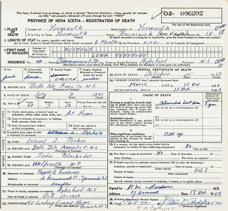 Birth Born on July 03, 1881 in Belleisle, Annapolis Co., NS Death Died on October 15, 1969 in Yarmouth, Yarmouth Co., NS Buried in Aylesford Union Cemetery in Aylesford, Kings Co., NS Marriages NICHOLS, William Lamert Married on December 26, 1911 in Belleisle, Annapolis Co., NS Children NICHOLS, Greta Margaret Jean: November 29, 1913 - 1988 NICHOLS, Gerald Borden: January 14, 1915 - September 06, 2002 NICHOLS, Wilfred Paul: March 25, 1916 - December 17, 2007 NICHOLS, Myrtle Eileen: November 06, 1917 - August 08, 2001 NICHOLS, Harley Parker: May 27, 1925 - June 02, 1925 Notes Death: Arteriosclerotic Heart Disease Sources Nova Scotia Deaths: Year 1969 #6202 Images Lena (Parker) Nichols Death William Nichols Marriage