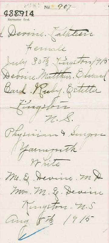 Birth Born on July 30, 1915 in Kingston, Kings Co., NS Death Died on March 17, 2015 in Windsor, Hants Co., NS Buried in Aylesford Union Cemetery in Aylesford, Kings Co., NS Marriages NICHOLS, Wilfred Paul Married on April 13, 1938 in Auburn, Kings Co., NS Children NICHOLS, Gary NICHOLS, David: June 19, 1941 - December 27, 2014 Notes Obituary: Kathleen Anita Nichols \endash 99, Windsor, passed away Tuesday evening, March 17, 2015, at Windsor Elms. Born in Kingston, she was the daughter of the late Dr. M. E. and Ruby (Card) Devine. She enjoyed sewing, gardening and cooking Sunday dinners for the family. She was a member of Aylesford Union Church and the UCW. Kathleen is survived by her son, Gary (Diane), Bedford; daughter-in-law, Doris Nichols, Windsor; grandchildren, John (Kathleen), Toronto; Gregory (Kelly), Halifax; Jeffrey, Toronto; Natasha (Ron) Armstrong, Fall River; seven great grandchildren. Along with her parents, she was predeceased by her husband, W. Paul Nichols; son, David; brother, Phillip Devine. Special thanks are extended to the staff of Osprey 1 at Windsor Elms. Arrangements have been entrusted to DeMont Family Funeral Home & Cremation Service, 419 Albert Street, P.O. Box 981, Windsor, NS B0N 2T0 (902-798-8317), where the funeral service will be held 2 p.m., Monday, March 23, 2015, Reverend Bill Gibson officiating. Reception will follow in the funeral home's Elmcroft Reception Centre. Spring interment in Aylesford Union Cemetery. If so desired, donations in Kathleen's memory to Canadian Cancer Society, 5826 South Street, Halifax, NS B3H 1S6 are welcomed. Messages of condolence may be sent to the family at the funeral home address or by visiting: www.demontfamilyfuneralhome.ca Sources Funeral Home: DeMont Family Funeral Home Windsor,NS Obituary March 2015 Images Kathleen Devine Birth Wilfred & Kathleen (Devine) Nichols Wilfred Nichols Marriage Kathleen Devine