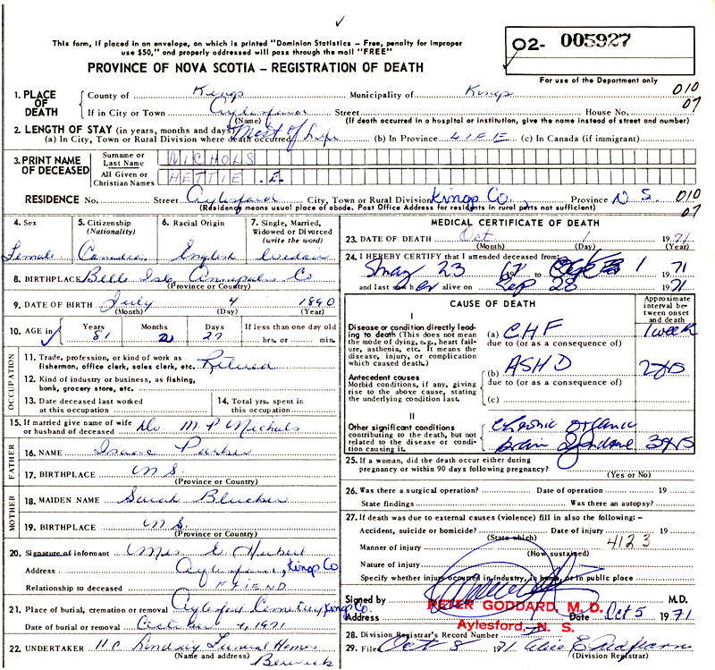 Birth Born on July 04, 1890 in Belleisle, Annapolis Co., NS Death Died on October 01, 1971 in Aylesford, Kings Co., NS Buried in Aylesford Union Cemetery in Aylesford, Kings Co., NS Marriages NICHOLS, Morley Puncheon Married on July 11, 1917 in Belleisle, Annapolis Co., NS Children NICHOLS, Frances LaVaughn: June 18, 1919 NICHOLS, Phyllis Jeanette: June 01, 1922 - July 18, 2014 NICHOLS, Thelma Bernice: March 22, 1926 - April 09, 2009 Notes Death: Congestive Heart Failure/ Arteriosclerotic Heart Disease Sources Nova Scotia Deaths: Year 1971 #5927 Images Hettie (Parker) Nichols Death Morley Nichols Marriage