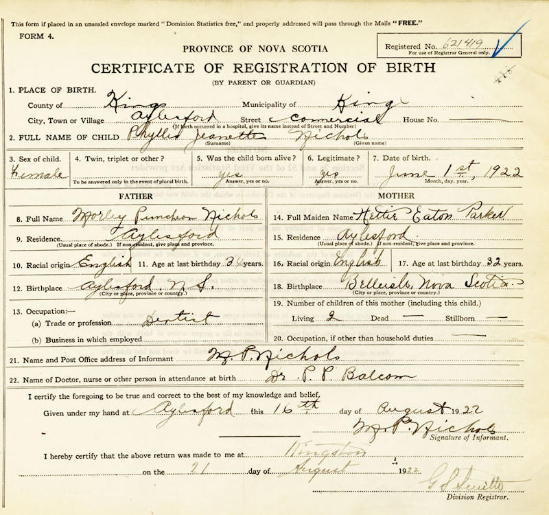 Parents Father: NICHOLS, Morley Puncheon Mother: PARKER, Hettie Eaton Birth Born on June 01, 1922 in Aylesford, Kings Co., NS Death Died on July 18, 2014 in Kentville, Kings Co., NS Buried in Aylesford Union Cemetery in Aylesford, Kings Co., NS Marriages HERBERT, Edward Clifford Married on July 21, 1942 in Aylesford, Kings Co., NS Children HERBERT, Timothy HERBERT, Daniel Notes Occupation: Employee at M.W. Graves & Co. Obituary: Herbert, P. "Jeannette" - age 92 years of Aylesford. The family of the late P. "Jeannette" (Nichols) Herbert are sad to announce her quiet passing in Valley Regional Hospital on July 18, 2014. She was born on June 1st, 1922 in Aylesford to Dr. Morley & Hettie Nichols in the same home she was brought up in and with the exception of two years, lived in the rest of her life. Educated in a three room school in Aylesford and at K.C.A. in Kentville for her 12th grade, then on to Wolfville for a business course at the former Horton Academy of Acadia University. She was employed at the Berwick division of M.W. Graves & Co. for several years during which time she married Edward Herbert on July 21, 1942. Jeannette was a life-long member of the Aylesford United Church, serving as a Sunday school teacher and treasurer of the United Church Women for many years and was also a honorary member of the U.C.W. She was proud to be elected the first lady Elder of her Church. Always a lover of sports, she played tennis in her teen years, later became a charter member of the Berwick Curling Club & curled every year into her late 80's. She was a "par 3" golfer and loved to garden, growing beautiful glad's that she sold road side for many years. Besides her sports, gardening and bridge she also enjoyed the family cottage for over 60 year at Morden on the Bay of Fundy. She is survived by son Tim & Carol Herbert, Ontario, son Danny & Joy Herbert, Auburn; Grandchildren John & Nancy Herbert,Ontario, Katie Herbert, Ontario, Jodi & Luke Denhaan, Clarence , Christopher & Josee Herbert, Alberta; great grandchildren, Haden, Madex & Roen Denhaan, Clarence, Rylan Herbert, Alberta; one sister "Bunny" Small, Aylesford; three nephews Greg Vidito, Halifax, Brian Vidito, PEI, Alan Small, Mass., one niece Elizabeth Burrows, Truro and several grand nieces and grand nephews. She was predeceased by her husband in Edward Herbert in January 1988 and her sister Thelma (Nichols) Vidito, Truro. No visitation by her request. The funeral service will be held at the Aylesford United Church on Thursday, July 24, 2014 at 3:00 pm. Burial in the Aylesford Union Cemetery and reception to follow in the Aylesford United Church Reception Hall. Donations may be made to a charity of one's choice. Online condolences may be made by visiting www.serenitylindsayfuneralhome.ca Arrangements entrusted to Serenity Lindsay Annapolis Valley Funeral Home, Berwick Chapel (192 Commercial St), 538-9900. Sources Funeral Home: Serenity Lindsay Funeral Home Berwick Chapel Berwick,NS Obituary July 2014 Images Phyllis Nichols Birth Phyllis Nichols Marriage Phyllis Nichols