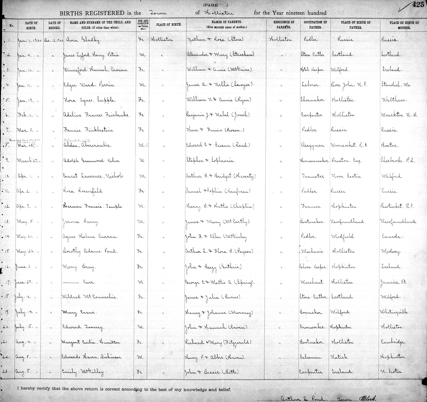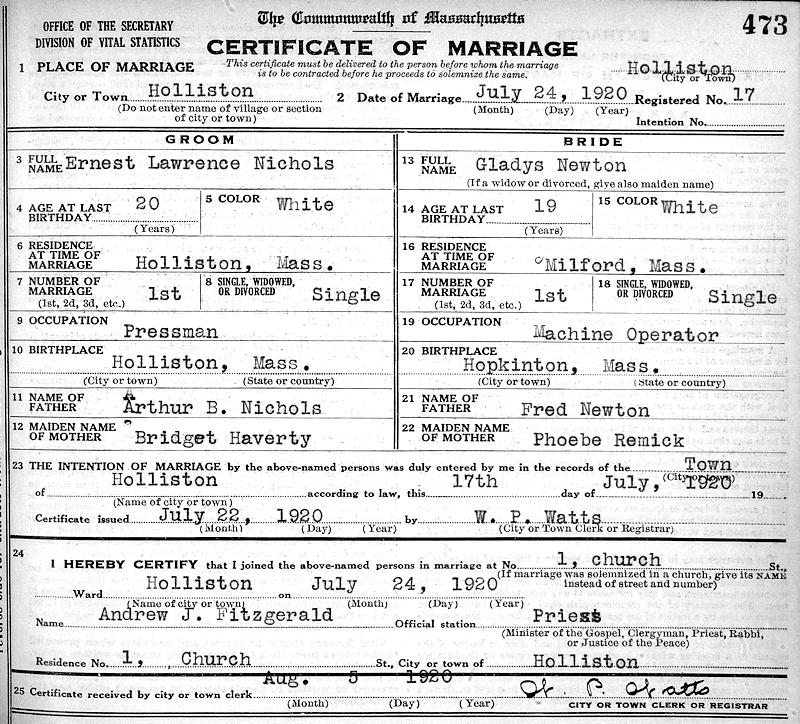 Parents Father: NICHOLS, Arthur Bernard Mother: HAVERTY, Bridget M. Birth Born on April 01, 1900 in Holliston, Middlesex Co., MA Death Died on September 19, 1974 in Natick, Middlesex Co., MA Buried in Saint Marys Cemetery in Holliston, Middlesex Co., MA Marriages NEWTON, Gladys Mae Married on July 24, 1920 in Holliston, Middlesex Co., MA Children NICHOLS, Madeline Rita: February 10, 1921 - July 04, 1979 NICHOLS, Ernest Lawrence: July 08, 1930 - May 27, 2019 NICHOLS, Arthur Bernard: February 11, 1934 - August 29, 1994 NICHOLS, Patricia A.: December 07, 1937 - January 25, 2020 Notes Occupation: Pressman/ Printer/ Worker Box Factory/ Truck Driver Sources Massachusetts Deaths: #044185 Images Ernest Nichols Birth Arthur & Bridget (Haverty) & Ernest Nichols Ernest Nichols WW1 Draft Ernest Nichols Marriage