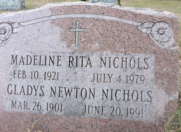 Parents Father: NICHOLS, Ernest Lawrence Mother: NEWTON, Gladys Mae Birth Born on February 10, 1921 in Framingham, Middlesex Co., MA Death Died on July 04, 1979 in Massachusetts, USA Buried in Saint Marys Cemetery in Holliston, Middlesex Co., MA Sources Massachusetts Cemeteries: Saint Marys Cemetery Holliston,MA Images Madeline Nichols Birth Madeline Nichols & Gladys (Newton) Nichols