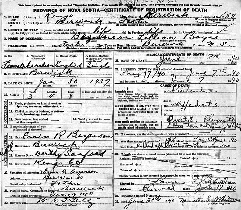 Parents Father: BEZANSON, Ervin Richard Mother: SANFORD, Dorothy Bernice Birth Born on January 30, 1937 in Berwick, Kings Co., NS Death Died on June 08, 1940 in Berwick, Kings Co., NS Buried in Berwick Cemetery in Berwick, Kings Co., NS Notes Death: Peritonitis Sources Nova Scotia Deaths: Year 1940 file 181 #688 Images Lillian Sanford Death