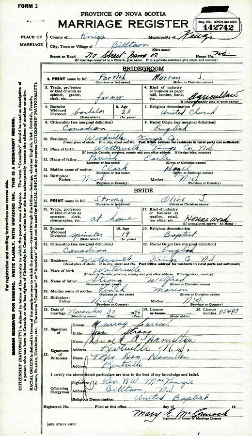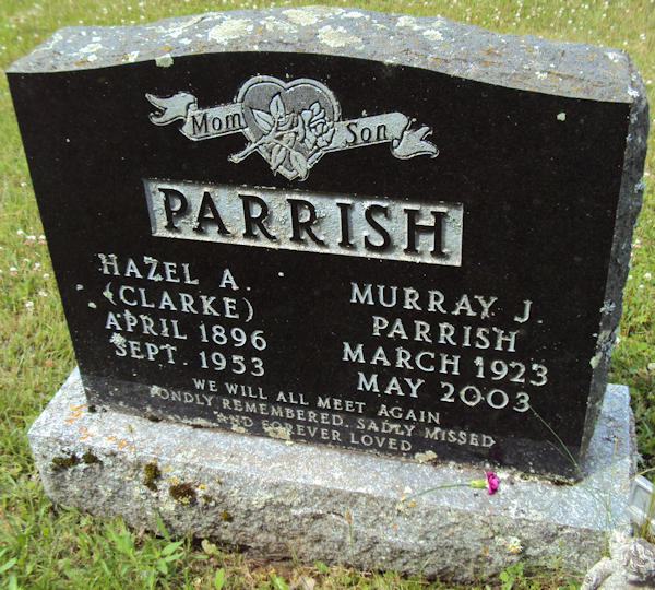 Birth Born on March 23, 1923 in Waterville, Kings Co., NS Death Died on 2003 in Kings Co., NS Buried in Lakeview Cemetery in Billtown, Kings Co., NS Marriages STRONG, Olive Ujeane Married on November 30, 1946 in Billtown, Kings Co., NS Children PARRISH, Terry PARRISH, Donna PARRISH, Marlene Notes Occupation: Farmer Sources Kings Cemetery Records: Lakeview Cemetery Billtown,NS Images Murray Parrish Birth Murray Parrish Olive Strong Marriage