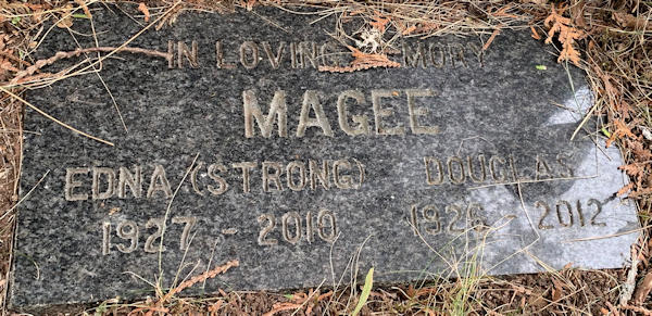 Parents Father: STRONG, Frank Carroll Mother: TAYLOR, Della Mary Birth Born on 1927 in South Waterville, Kings Co., NS Death Died on 2010 in Kentville, Kings Co., NS Buried in Berwick Cemetery in Berwick, Kings Co., NS Marriages MAGEE, Douglas Glendon Married on October 11, 1947 in Waterville, Kings Co., NS Children MAGEE, Glen MAGEE, Sheila MAGEE, Byron MAGEE, Allen Sources Kings Cemetery Records: Berwick Cemetery Berwick,NS Images Douglas & Edna (Strong) Magee Edna Strong Marriage